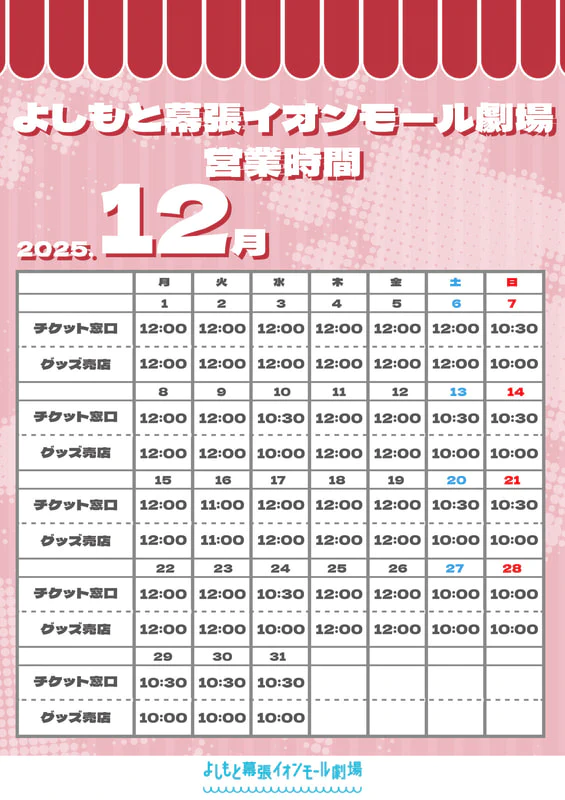 劇場売店12月営業カレンダーのお知らせ(12/7追記)